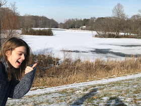 It really, really is freezing. This white area Samantha is pointing to is a lake. Usually, it's a liquid. Today, it's a solid, at least on the surface. The snow on the lake is sitting on the ice on the lake and those poor fishes and turtles under there - well, let's just hope they have somewhere to ride this out.